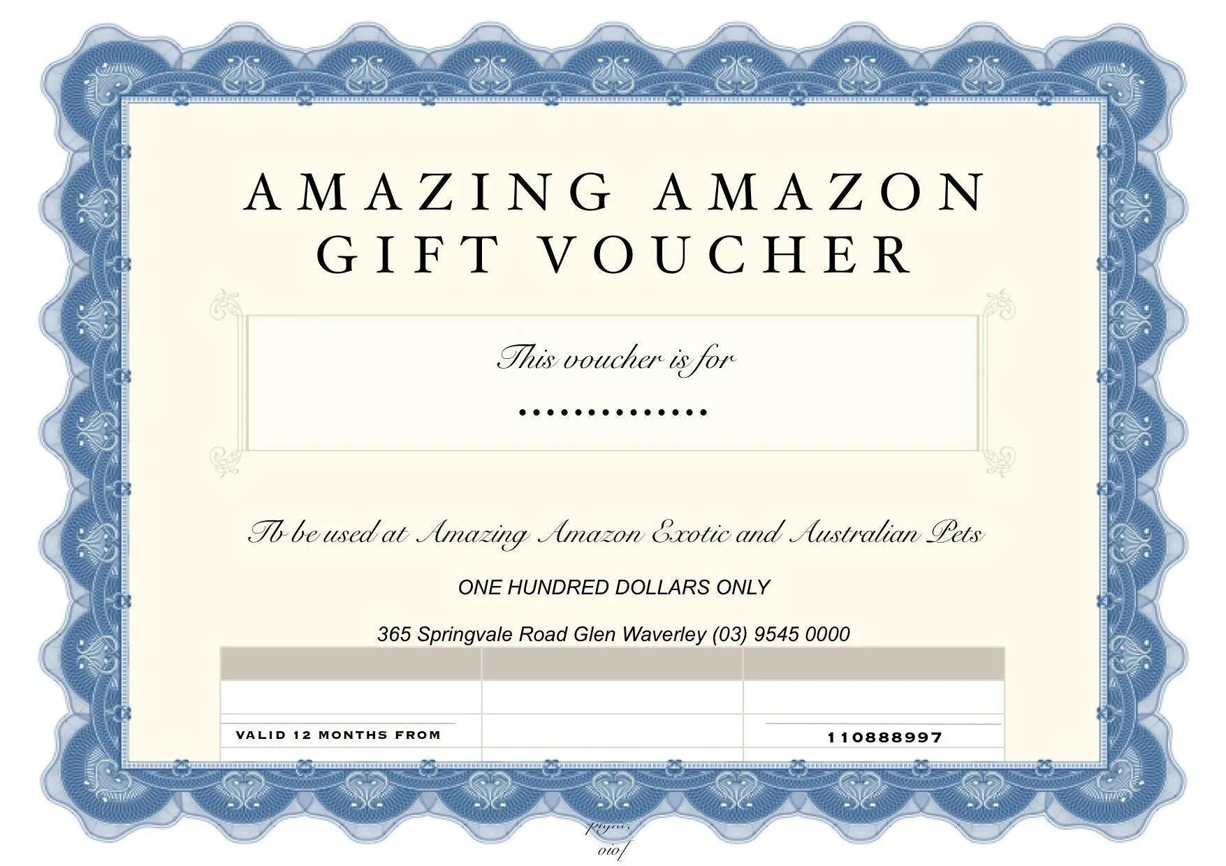 $100 Gift Voucher for Amazing Amazon.Upon order we will send you a blank Gift Certificate with just the amount on it so you can then fill out the receivers name or alternatively you can give us their name and address and we can send it directly to them.Please ensure you let us know how you would like us to do it.