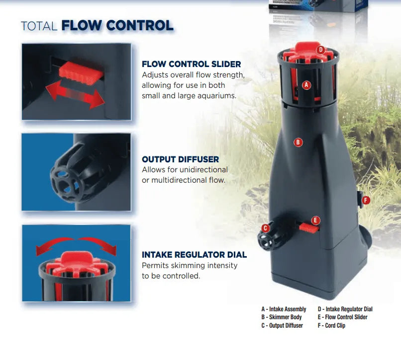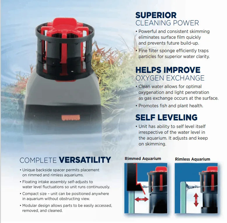 The SK400 Surface Skimmer removes unwanted water surface film to help improve oxygenation and light penetration for a cleaner and healthier aquarium. Over time, surface films can develop from oils on your skin, household dust, cooking smoke, fat content within fish food and more.