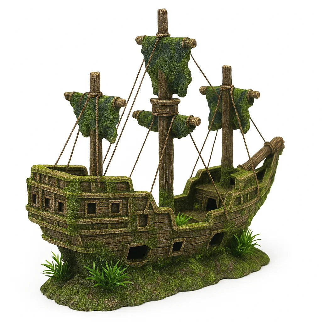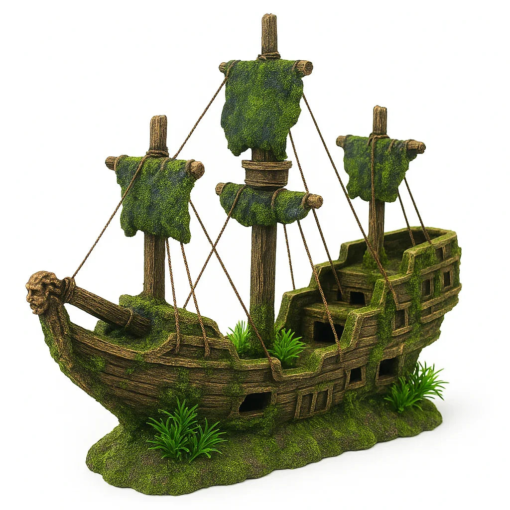 Bring timeless maritime charm to your aquarium with the Bioscape Shipwreck with Moss Aquarium Ornament (32cm) – a detailed replica of a moss-covered clipper shipwreck. Designed to mimic the grandeur of a sunken 19th-century sailing vessel, this ornament adds depth, mystery, and realism to your aquascape. Its worn wooden hull, weathered sails, and intricate rigging create the perfect centrepiece for both freshwater and marine tanks.