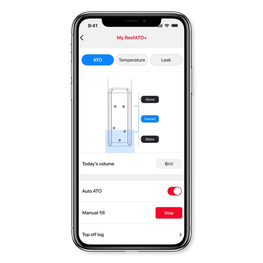 If a leak is detected the ATO Auto-fill is immediately disabled, and after a few seconds to confirm that the leak persists, the controller sounds an optional audible alarm and sends a notification to your mobile device.