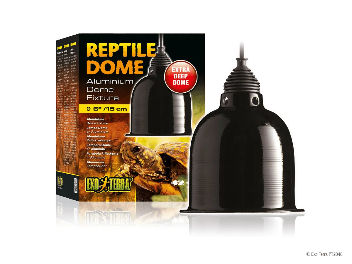 The Exo Terra Reptile Dome has an extra long aluminum reflector dome that extends beyond the face of most bulbs. The Reptile Dome Fixture gives you the versatility of placing heat and/or light sources on your terrarium where needed. The aluminum reflector increases the light, UVA and UVB output significantly!