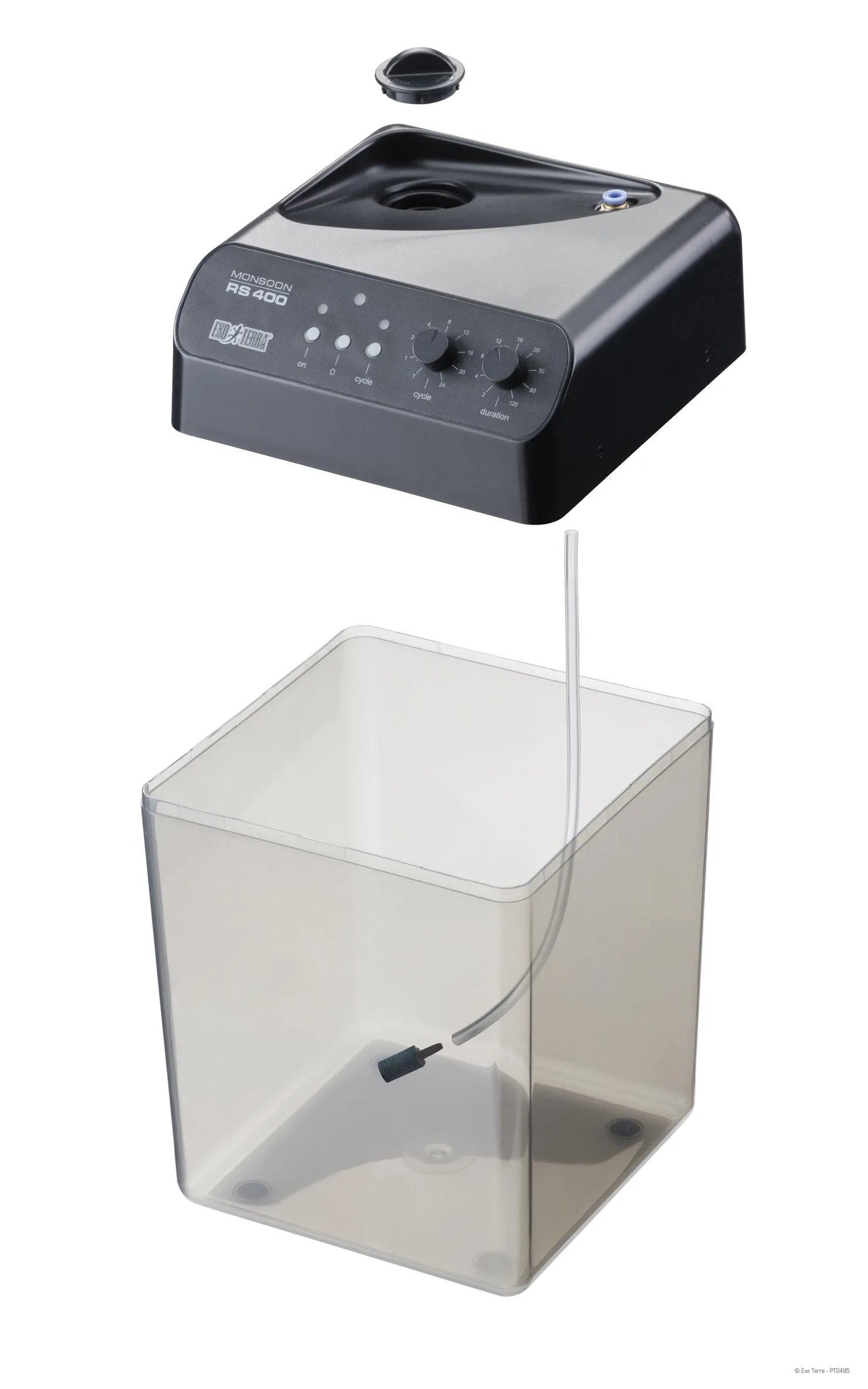 The Exo Terra Monsoon RS400 is a programmable rainfall system suitable for all types of terrariums and greenhouses. It helps maintain optimal humidity by generating precipitation at programmed intervals, the duration and frequency of which can be easily adjusted depending on the type of animal or plant housed. Frequent rainfall helps stimulate breeding behaviour, and is a necessity when housing live tropical plants such as Bromeliads, orchids, mosses, etc.