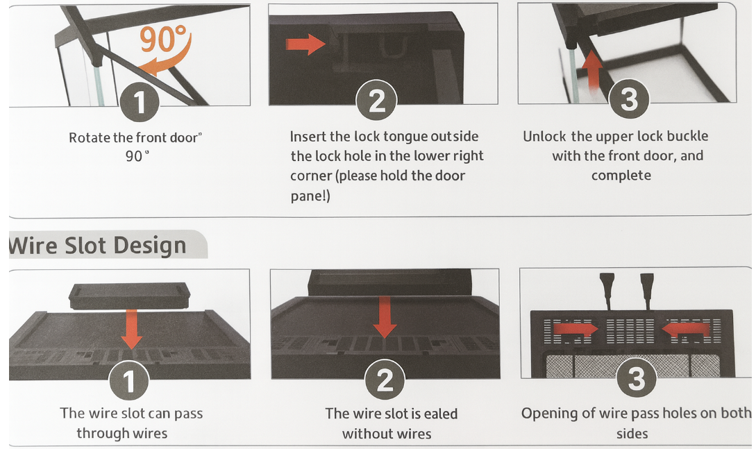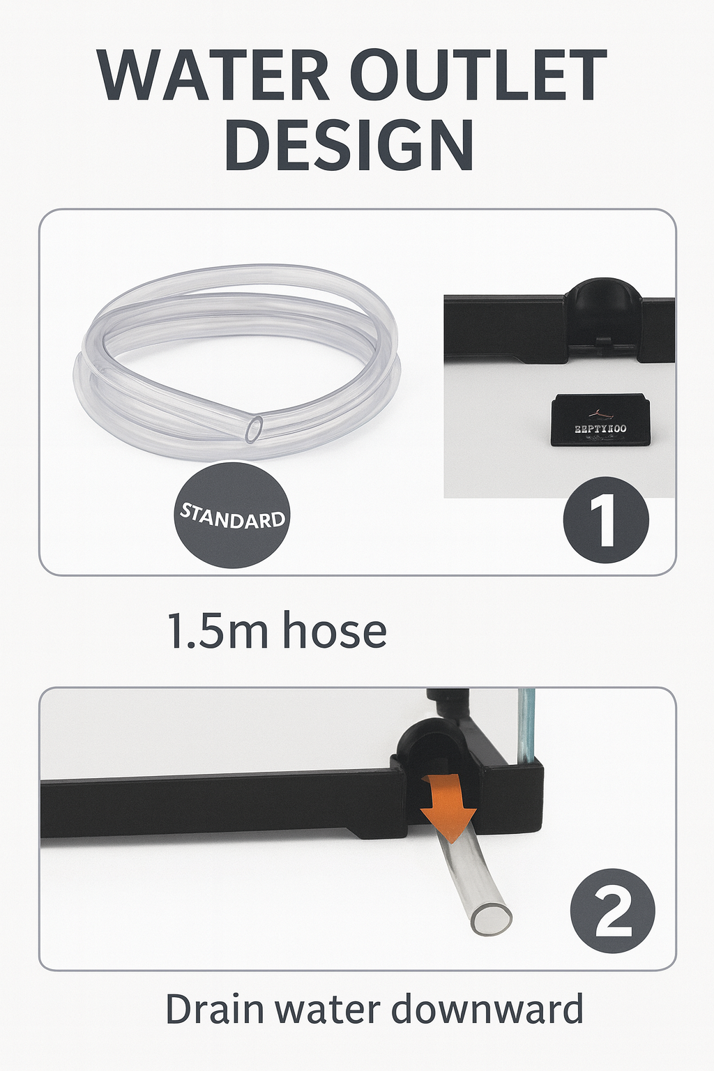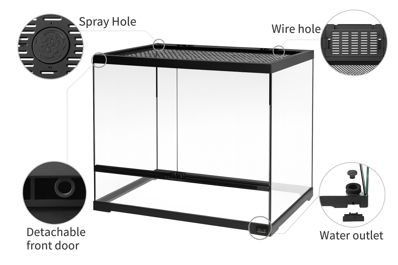 For convenience, the terrarium comes with a drain hole and hose for quick water changes and is pre-fitted with ports for misting systems and cable access points for heaters, thermostats, and lighting. The 1 cm raised base allows safe installation of heat mats or heat cords without compromising airflow.