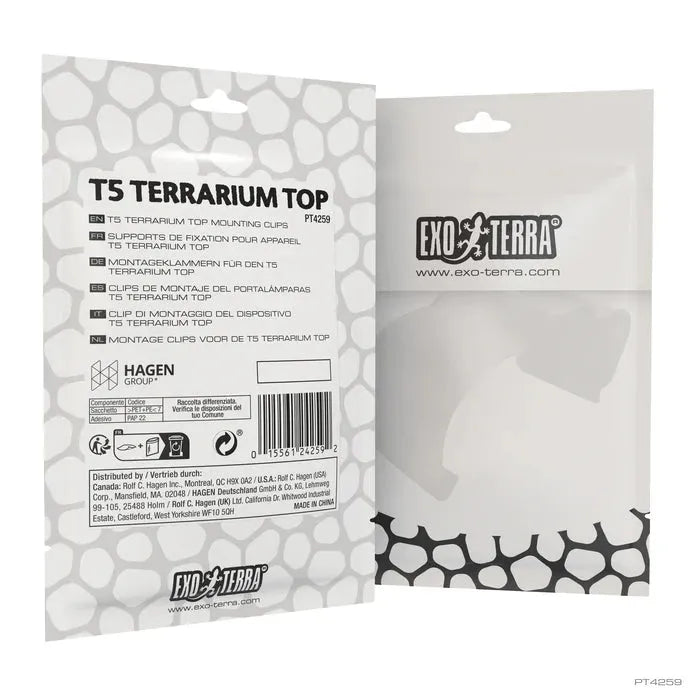 Mount your terrarium top with ease using Exo Terra's T5 mounting clips. These durable clips secure your terrarium top in place, ensuring the safety and comfort of your reptile. Plus, with a 2 pack included, you'll have everything you need for a secure set up. Experience reliable and convenient installation with Exo Terra.