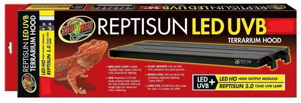 Zoo Med ReptiSun LED UVB Terrarium Hood features ReptiSun LED Modules comprised of 6500K daylight high output LEDs for truly naturalistic lighting, 620 nm Red LEDs to stimulate live plant growth, and 465 nm Blue LED for a soothing, nighttime lighting. Highly polished curved reflector for ReptiSun UVB Lamp maximizes efficient UVB penetration.