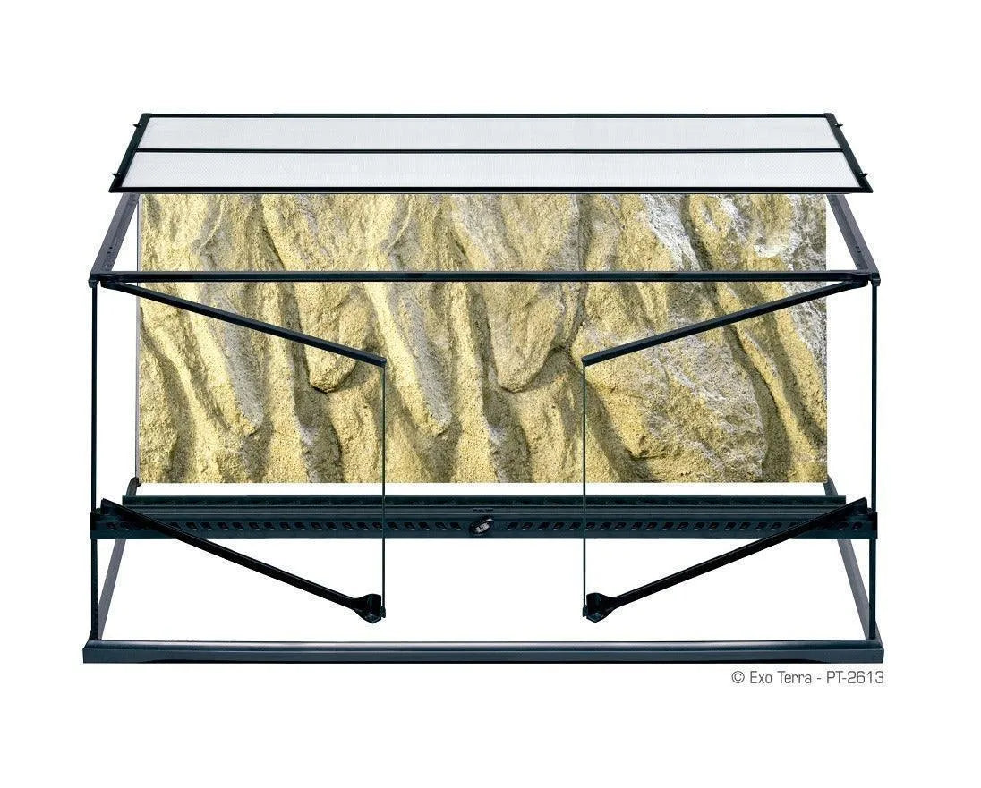 The bottom plate of the terrarium is raised to mount a substrate heater to heat a part of the extended ground surface. The extra high fixed front window is ideal for thick layers of substrates (burrowing reptiles), aquatic parts (paludarium) or to mount an Exo Terra reptile den. The natural background is in the same colour like all other Exo Terra decoration items (Water Dishes, Waterfalls, Heat Wave Rocks, etc.) and provides an extra climbing dimension.