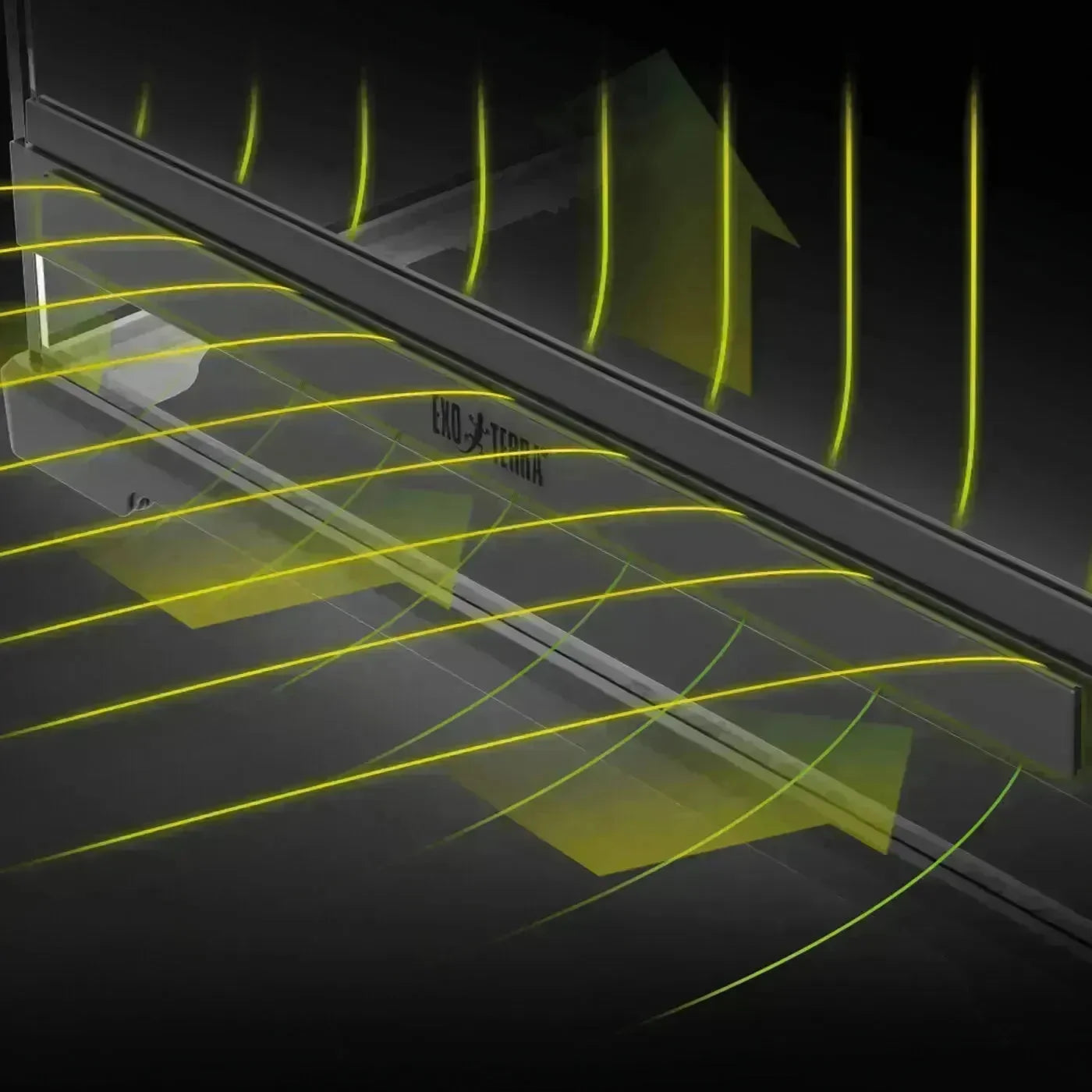 Its concealed ventilation maintains a clean aesthetic, infusing the terrarium with an elegant touch. Beyond aesthetics, this terrarium offers an advanced three-tier adjustable airflow system, giving you precise control over the environment. The patented forced vertical airflow is designed to prevent condensation effectively, ensuring clear views and a healthier habitat. The improved air circulation is crucial for the respiratory health of reptiles and amphibians. The integrated dirt collector captures any escaping dust or sand from the vent holes, ensuring a mess-free environment.