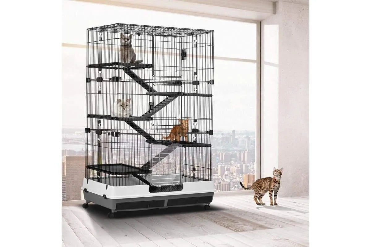 Owning a pet is a wonderful thing in our daily life and he/she brings us lots of joy and happiness. It’s our responsibility and honour to give them a comfortable and spacious home to play, rest and sleep and keep them happy and healthy. Now house your lovely rabbits, cats, guinea pigs or ferrets in our 5-level cage to begin a wonderful journey of raising animals. The multi-level small animal home is spacious enough for your bunnies to jump up and down or move around freely. Its sturdy construction and thoughtful design with chew-proof wire mesh frame and a removable plastic tray offer a strong, durable and hygiene living area. Thanks to its rolling casters, this rabbit cage allows you to keep your pets indoors or outdoors quickly and easily.