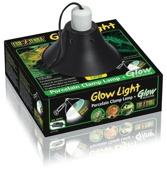 The Exo Terra Glow Light gives you the versatility of placing heat and/or light sources on your terrarium where needed. The device is sturdily constructed, with a metal reflector, heat resistant ceramic socket, and a spring-loaded swivel clamp. It can be easily turned off and on by the switch, mounted on the extra long power cord.