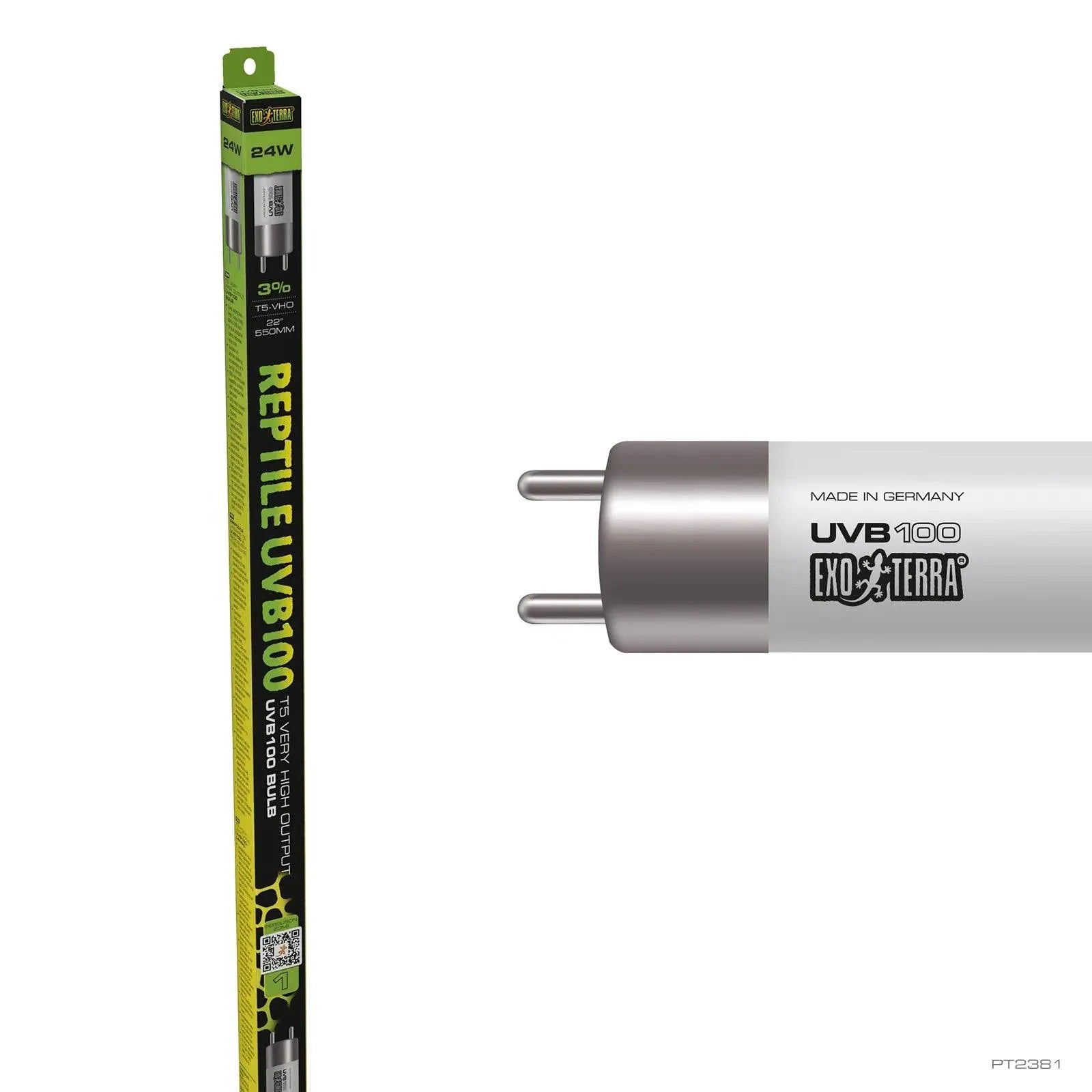 Exo Terra’s exceptional T5 lamps are crafted in Germany to the highest quality standard, ensuring a prolonged UV output of 12+ months for lasting performance. With its intense output of UVA and UVB rays combined with a well-balanced visible light spectrum8 the Exo Terra Reptile UVB100 T5 Very High Output Bulb is specifically designed to meet the needs of reptiles, amphibians and invertebrates inhabiting the Cryptophotic Zone. The intensity of the emissions varies depending on the distance from the basking area.