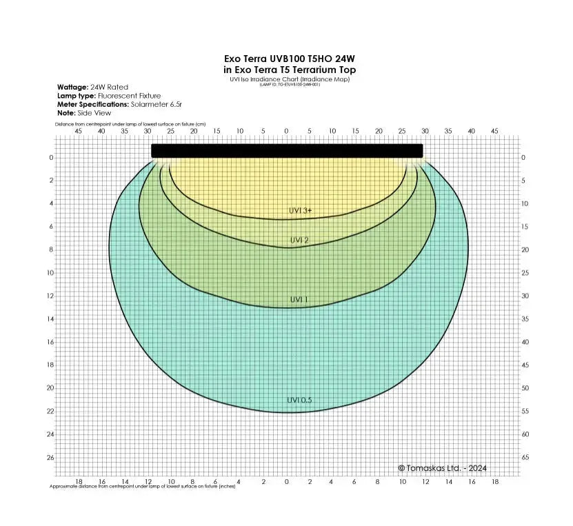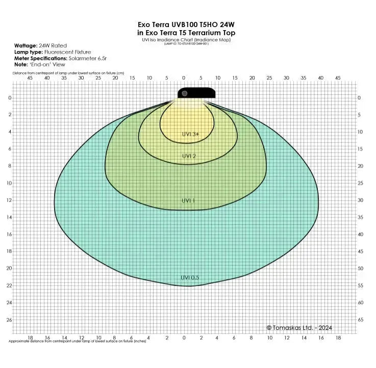 Exo Terra’s exceptional T5 lamps are crafted in Germany to the highest quality standard, ensuring a prolonged UV output of 12+ months for lasting performance. With its intense output of UVA and UVB rays combined with a well-balanced visible light spectrum8 the Exo Terra Reptile UVB100 T5 Very High Output Bulb is specifically designed to meet the needs of reptiles, amphibians and invertebrates inhabiting the Cryptophotic Zone. The intensity of the emissions varies depending on the distance from the basking area.
