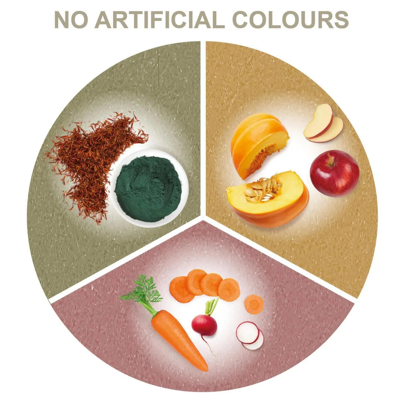 • No artificial colours, only natural colours obtained from plant concentrates: yellow from pumpkin and apple, red from carrots and radish, green from spirulina algae and safflower.