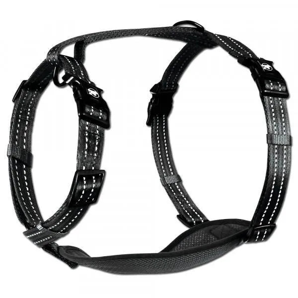 Help your dog stand out during any adventure with our reflective, comfortable  adventure harness. it features mesh padding for comfort and reflective accents for visibility. it features 3 buckles so it's easy to put on and take off. simply, put it on like a collar then put the mesh panel in the middle of your dog's chest. bring the waist strap around your dog and connect the buckles to the back strap. done and done! the collar and waist bands adjust for your dog's optimal comfort.