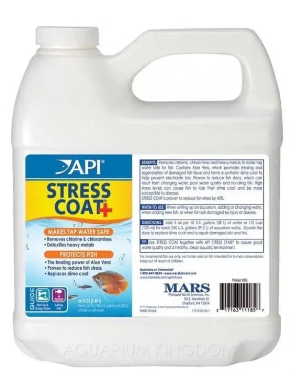 API Stress Coat makes tap water safe and contains the healing power of Aloe Vera, scientifically proven to reduce fish stress and heal damaged tissue. It forms a synthetic slime coating and replaces the natural secretion of slime that is interrupted by handling, shipping, fish fighting, or other forms of stress. Helps reduce susceptibility to disease and infection. Helps heal torn fins and skin wounds. Also works instantly to remove chlorine and chloramines from tap water and neutralizes heavy metals.