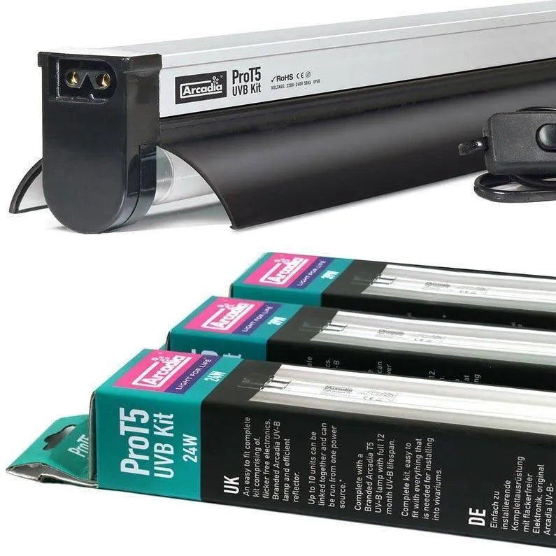The Arcadia Reptile ProT5Kit is available all three standard HO-T5 wattages (24, 39, 54watts) and includes our high quality, German made UV-B lamps.