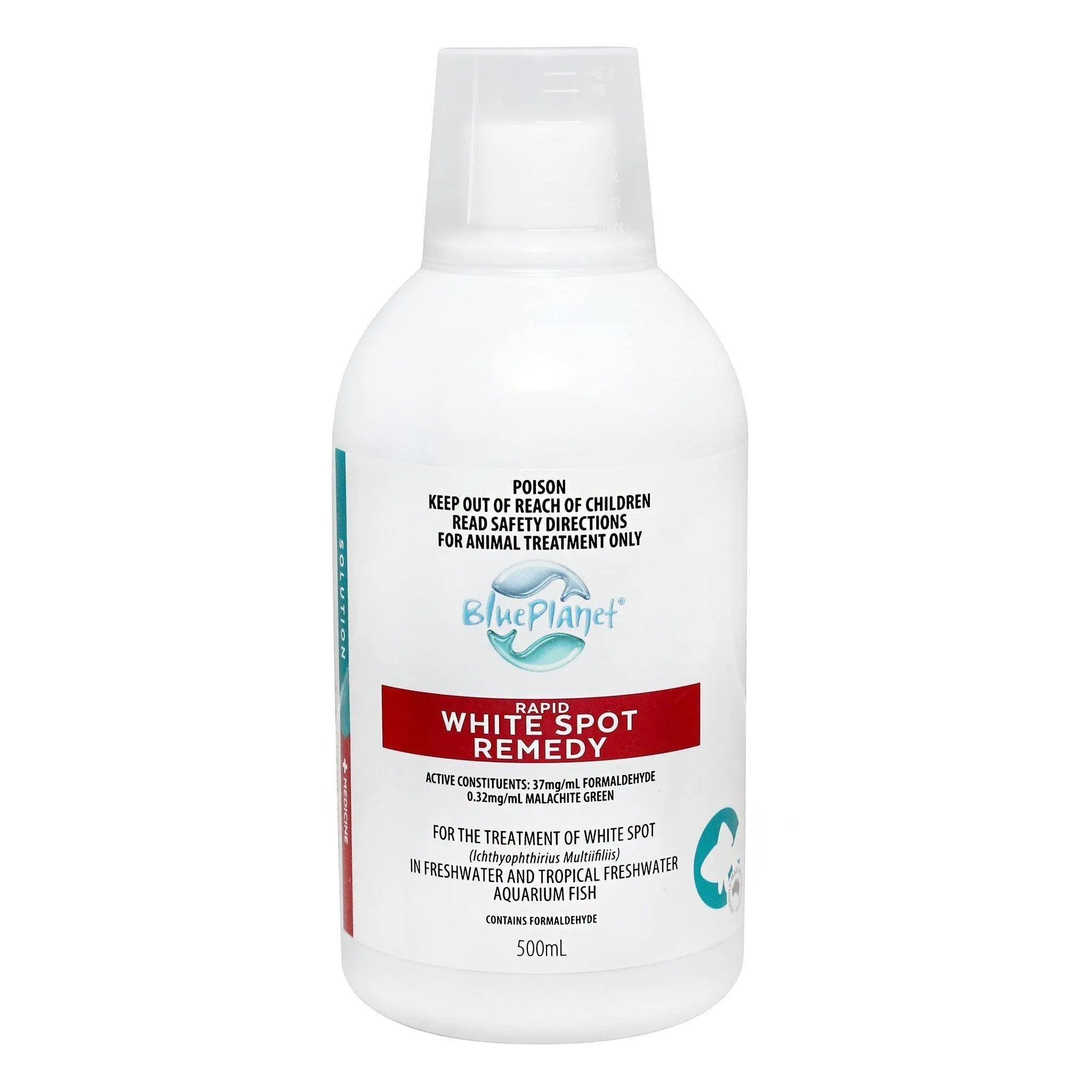 Blu Plant Whte Spot treatment for fish is a broad spectrum medication for treatment of white spot (ichthyophthirius multifiliis), velvet disease (oodinium spp.), and fungal disease in goldfish, freshwater and tropical freshwater fish. White Spot is a common fish parasite that can be introduced via new fish, plants or can appear when fish are stressed either from temperature change or a change in environment. These parasites appear as small white spots (pin head size) on the fish's body fins. Unless prompt action is taken, fatalities will occur.