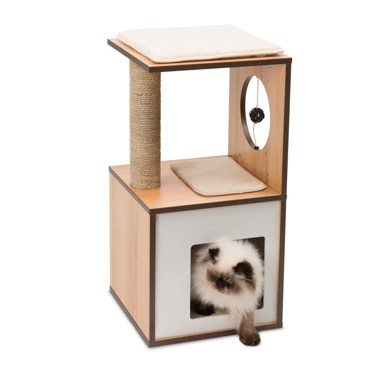 Catit Vesper Box furniture has a sturdy MDF construction with a classy wood-look laminate finish, and can be renewed with replacement parts to last a lifetime. The included cushion on the top perch allows for perfect cat naps, as the memory foam inside molds exactly to your cat’s body shape, providing extra support as your feline snoozes away.