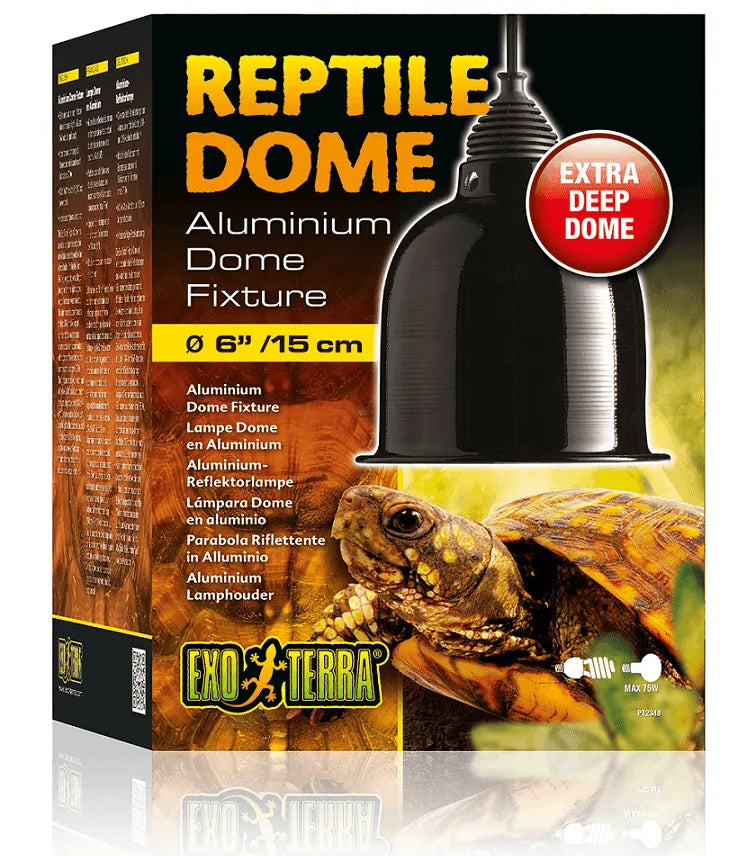 The Exo Terra Reptile Dome has an extra long aluminum reflector dome that extends beyond the face of most bulbs. The Reptile Dome Fixture gives you the versatility of placing heat and/or light sources on your terrarium where needed. The aluminum reflector increases the light, UVA and UVB output significantly!