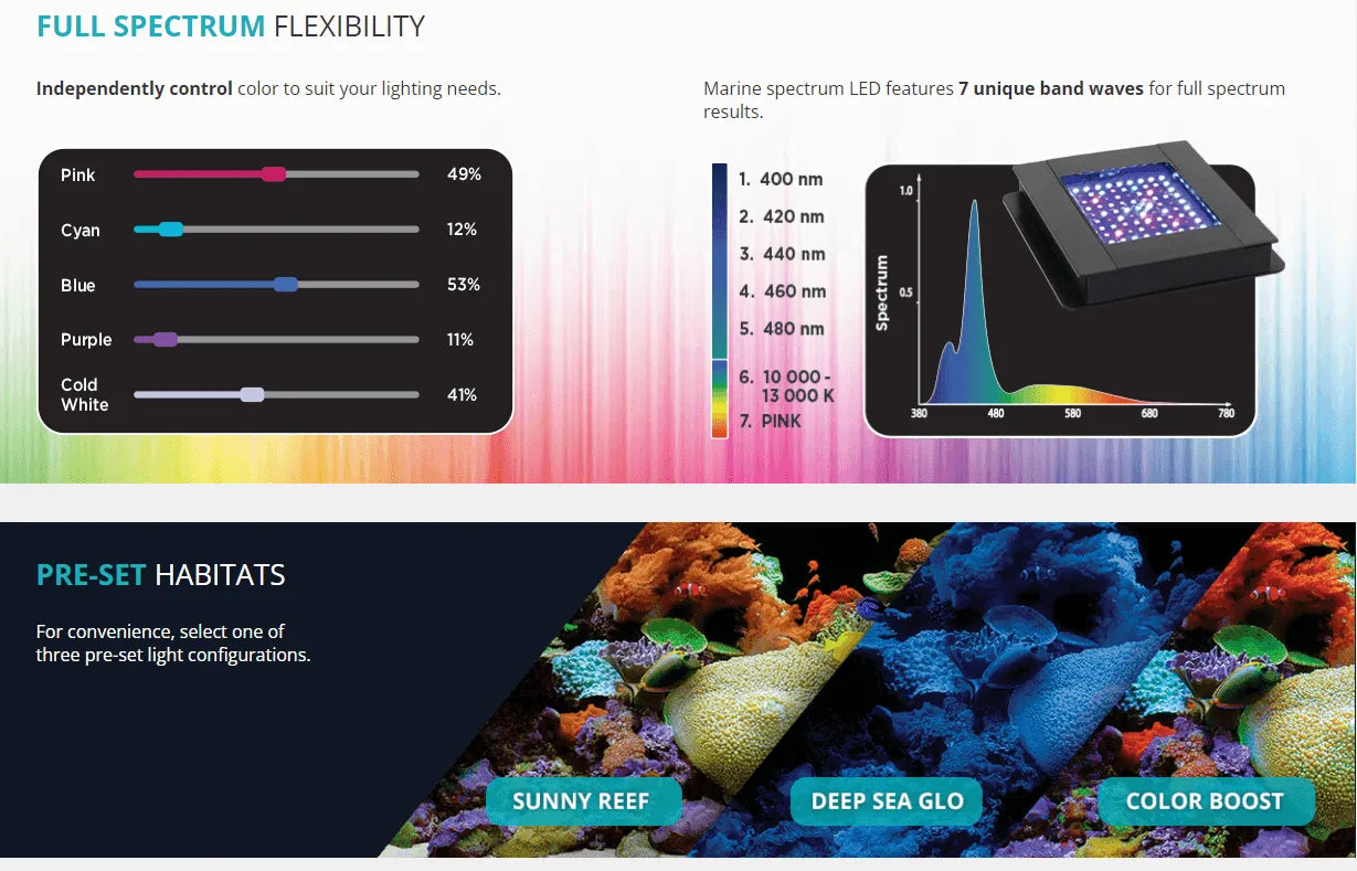 - Optional pre-set habitat light configurations (Sunny Reef, Deep Sea Glo, Color Burst)