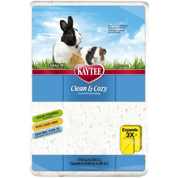 Kaytee Clean & Cozy White small pet paper bedding gives you a whole new standard in super-soft, absorbent bedding. Clean & Cozy is soft and fluffy to encourage burrowing or nesting while absorbing two times more liquid than wood shavings. Clean & Cozy's absorbency means less odor. That's why Clean & Cozy has an odor control guarantee. Plus Clean & Cozy is 99% dust free for a cleaner cage.