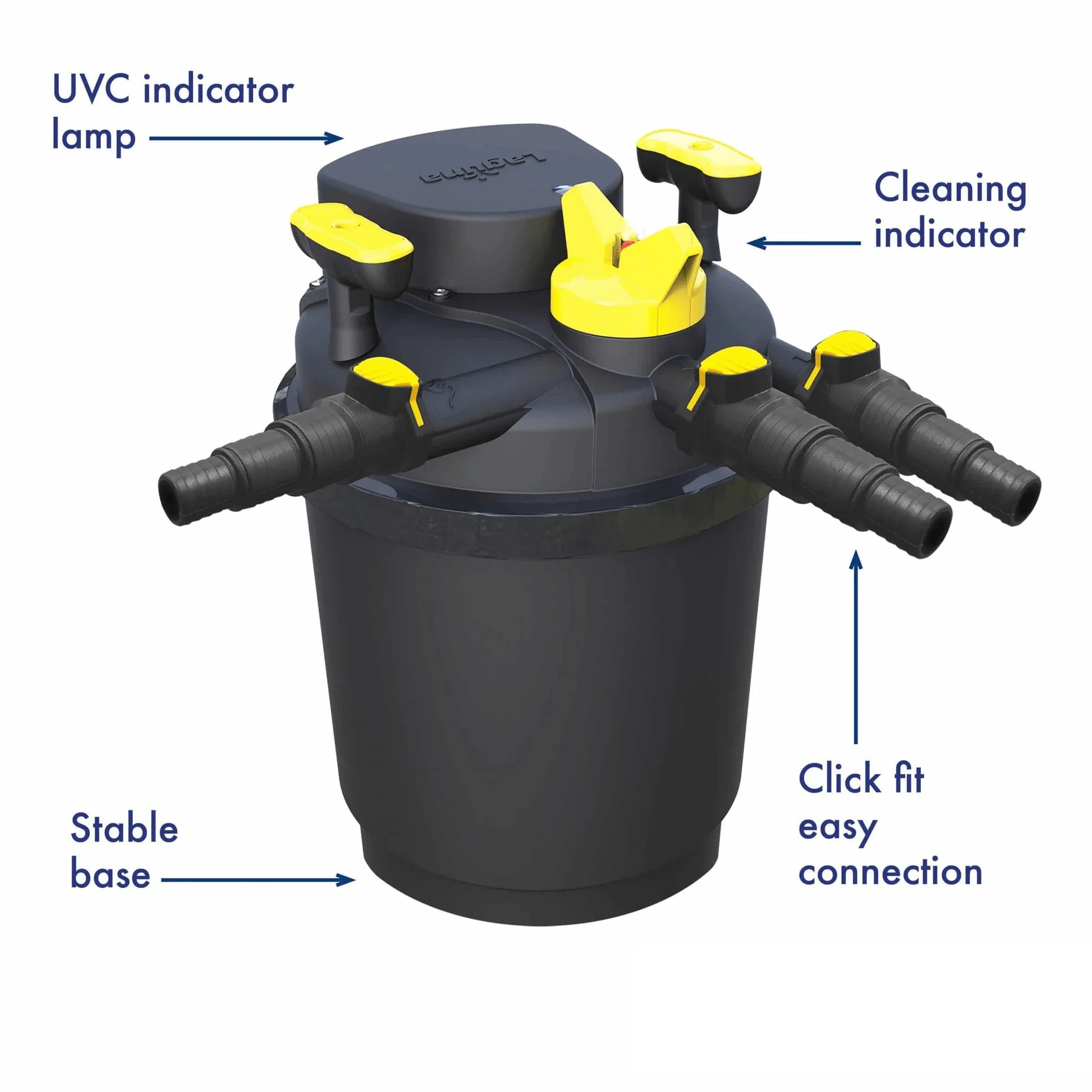 This pre-filtered water progresses into the filter bio media material where fish toxins are removed. The pre-cleaned water enters dirt-free passing along an 13W integrated UVC lamp. The pond water is exposed to ultraviolet rays that inhibit the growth of algae. The benefits of having pre-filtered water entering the UVC unit enhances the effectiveness of the UVC lamp, which in turn helps to reduce algae and reduce the risk of fish disease borne bacteria and pathogens. Water finally returns to the pond thoroughly cleansed.