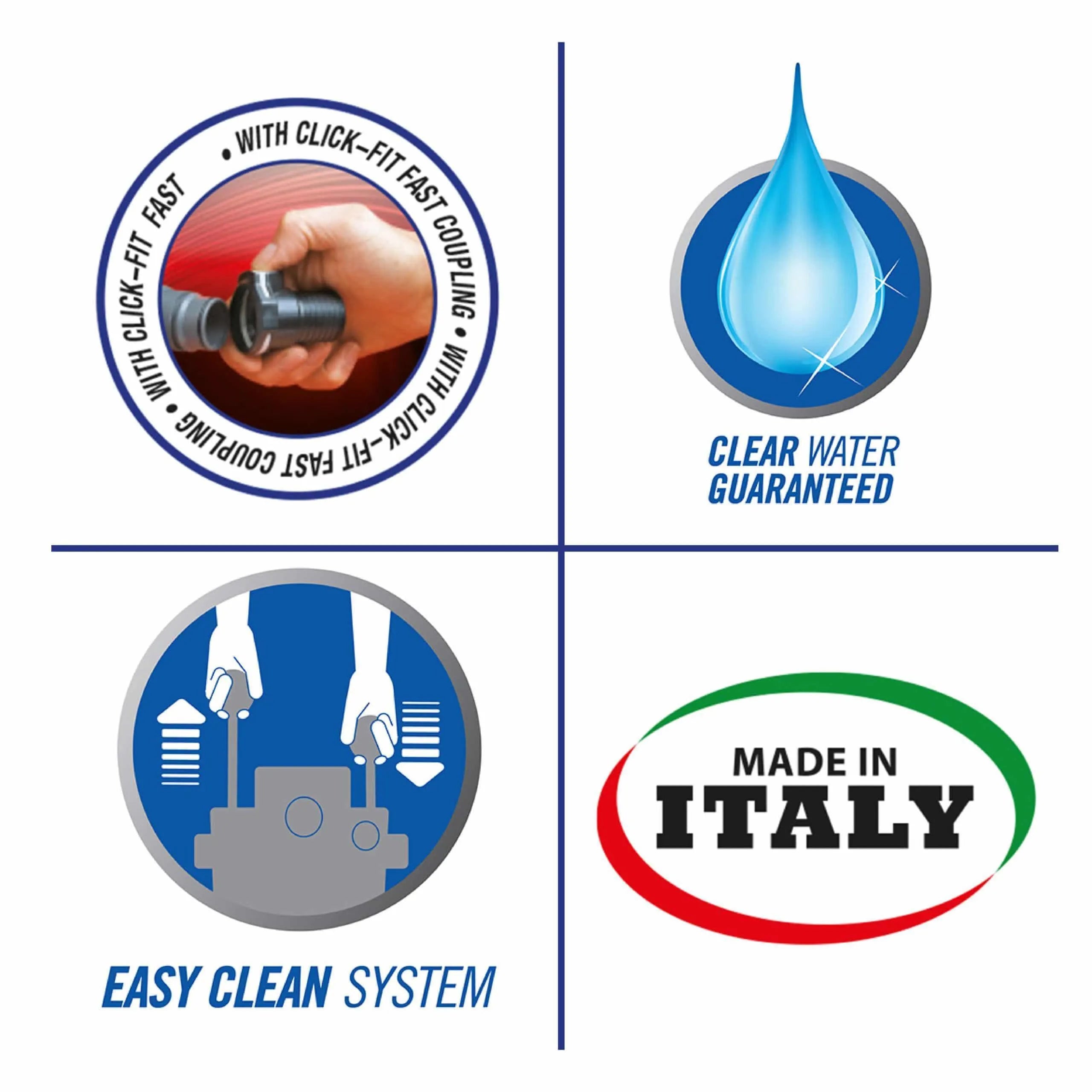 The Pressure-Flo features a revolutionary patented Easy Clean Backwash-Cleaning System that easily cleans the soiled surfaces of the foam filters. This patented system is the only one of its kind. Backwash cleaning can easily and comfortably be completed in a few minutes without opening the lid. This feature ensures that the filter performs at optimal levels for many days and prolongs the time between full maintenance sessions. The unit can be installed in or above ground.