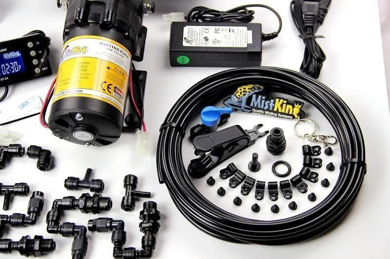 24V DC misting pump, capable of running up to 20 nozzles. Pump is very robust and can run dry!!! This pump has been tested for a long time in the field and in the factory and by us personally. It has extremely low failure rates and it simply WORKS! We went through a lot of pumps before arriving at this one. Custom manufactured for MistKing.com and is unique to us. Pump is adapted for 1/4" tubing and includes vibration dampening rubber feet.