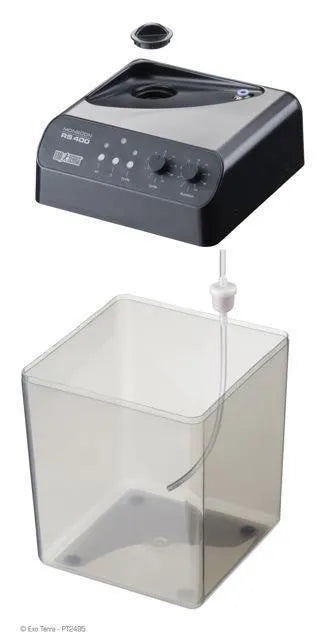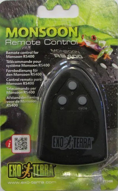 The Exo Terra Monsoon Remote Control works with the Exo Terra Monsoon RS400, enabling you to switch the unit to the on, off and cycle positions remotely. It's also great for temporarily turning the unit on and off; to increase the humidity manually; to test the nozzle performance; or to simply make sure the unit operates properly Switching the unit On/Off from a distance will also help to prevent stress to the animals * 2 AAA batteries not included.
