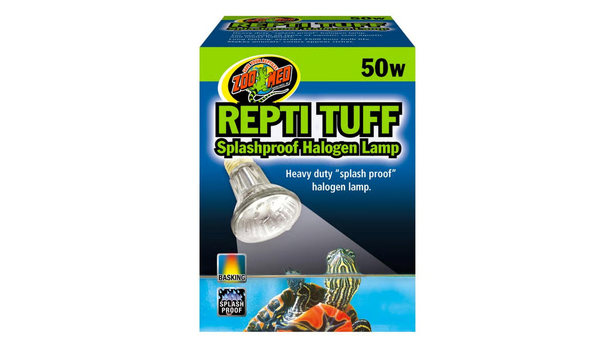 The Zoo Med Repti Tuff 50W Splashproof Halogen Lamp is a heavy-duty basking bulb designed for use in high-humidity environments or misted enclosures. Its rugged, splash-resistant design makes it perfect for reptiles that require a reliable heat source in aquatic, semi-aquatic, or tropical setups.